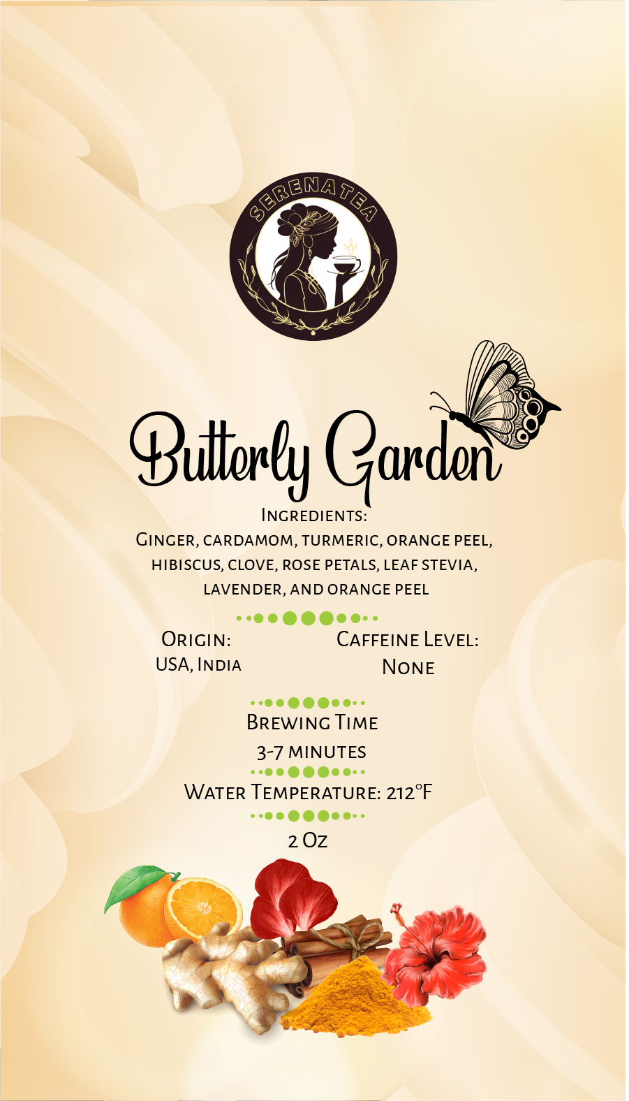 Step into a world of enchantment with our Butterfly Garden Tea. This captivating blend combines ginger, cardamom, turmeric, orange peel, hibiscus, clove, rose petals, leaf stevia, lavender, and a touch of orange peel. Indulge in the harmonious dance of flavors that unfold with each sip, creating a truly magical tea experience.
