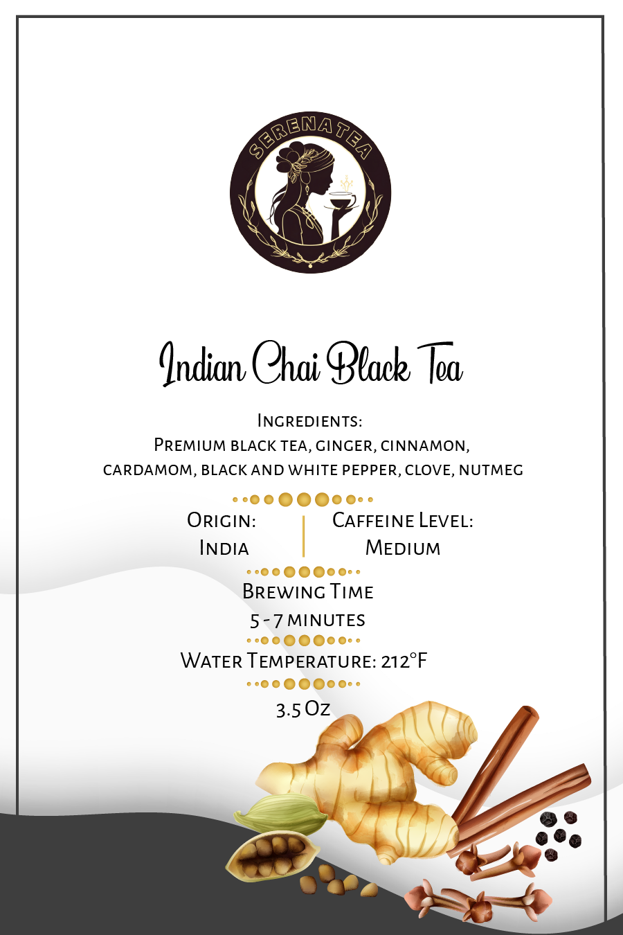 Ingredients: Premium Black Tea, Ginger, Cinnamon, Cardamom, Black & White Pepper, Clove, Nutmeg