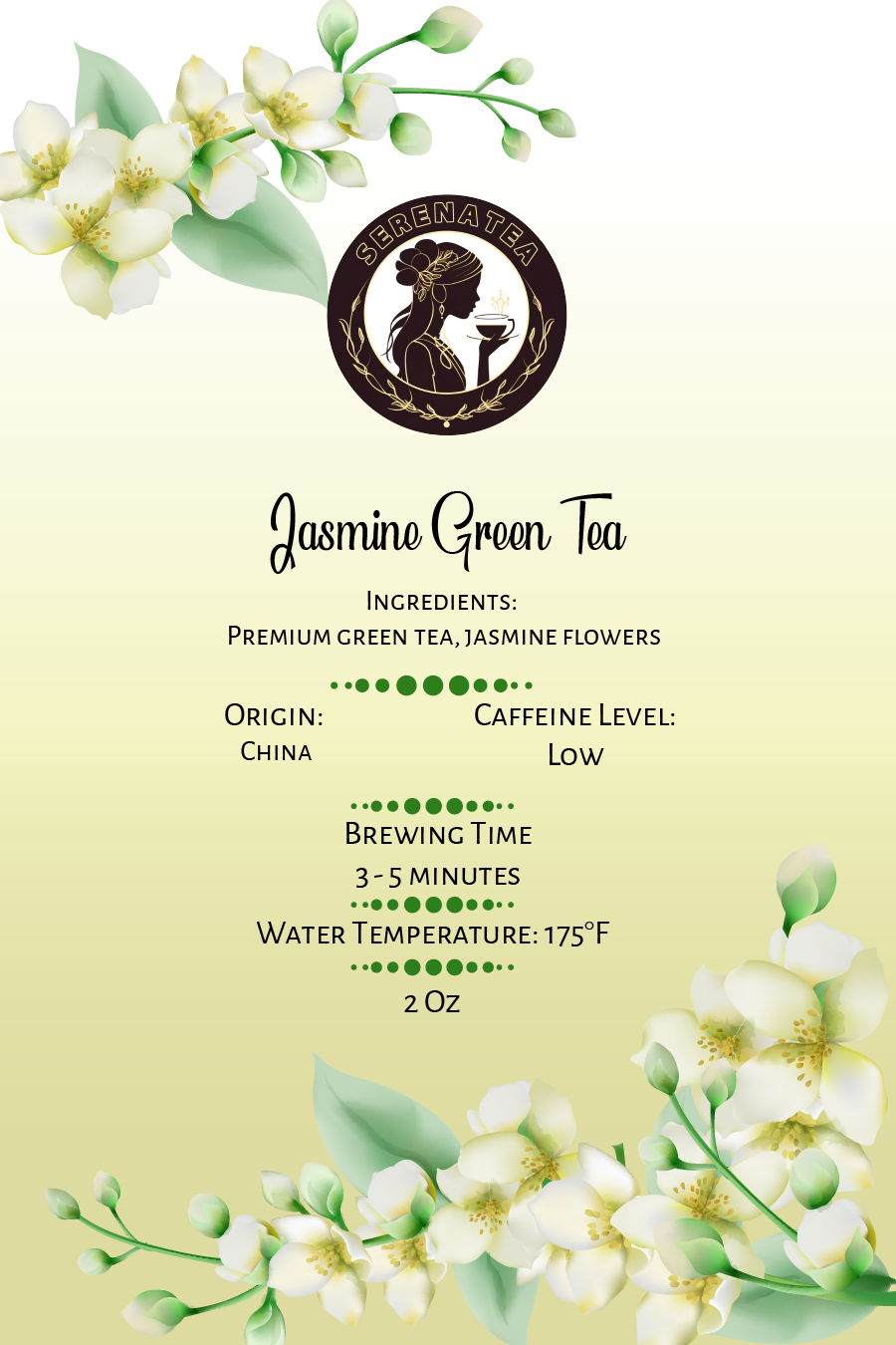 Savor the calming and rejuvenating qualities of our Jasmine Green Tea. With its enticing aroma and elegant taste, it offers a tranquil escape from the demands of the day. Whether enjoyed as a morning pick-me-up or a calming respite in the afternoon, this tea will delight your senses and leave you feeling refreshed. Awaken your palate to the enchantment of Jasmine Green Tea. Let its captivating flavors transport you to a world of pure bliss and relaxation. Embrace the soothing aroma and indulge in a cup of tranquility with every sip of this exquisite blend.