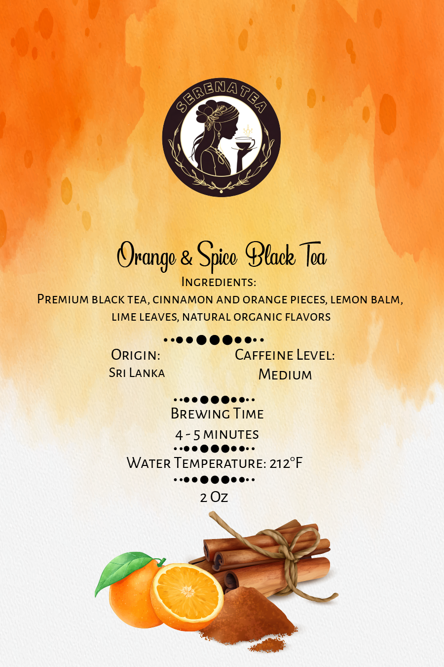 Ingredients: Premium Black Tea Leaves, Orange Peel, Cinnamon Clove, Nutmeg, Allspice, Natural Orange Flavors, Organic Spice Blend
