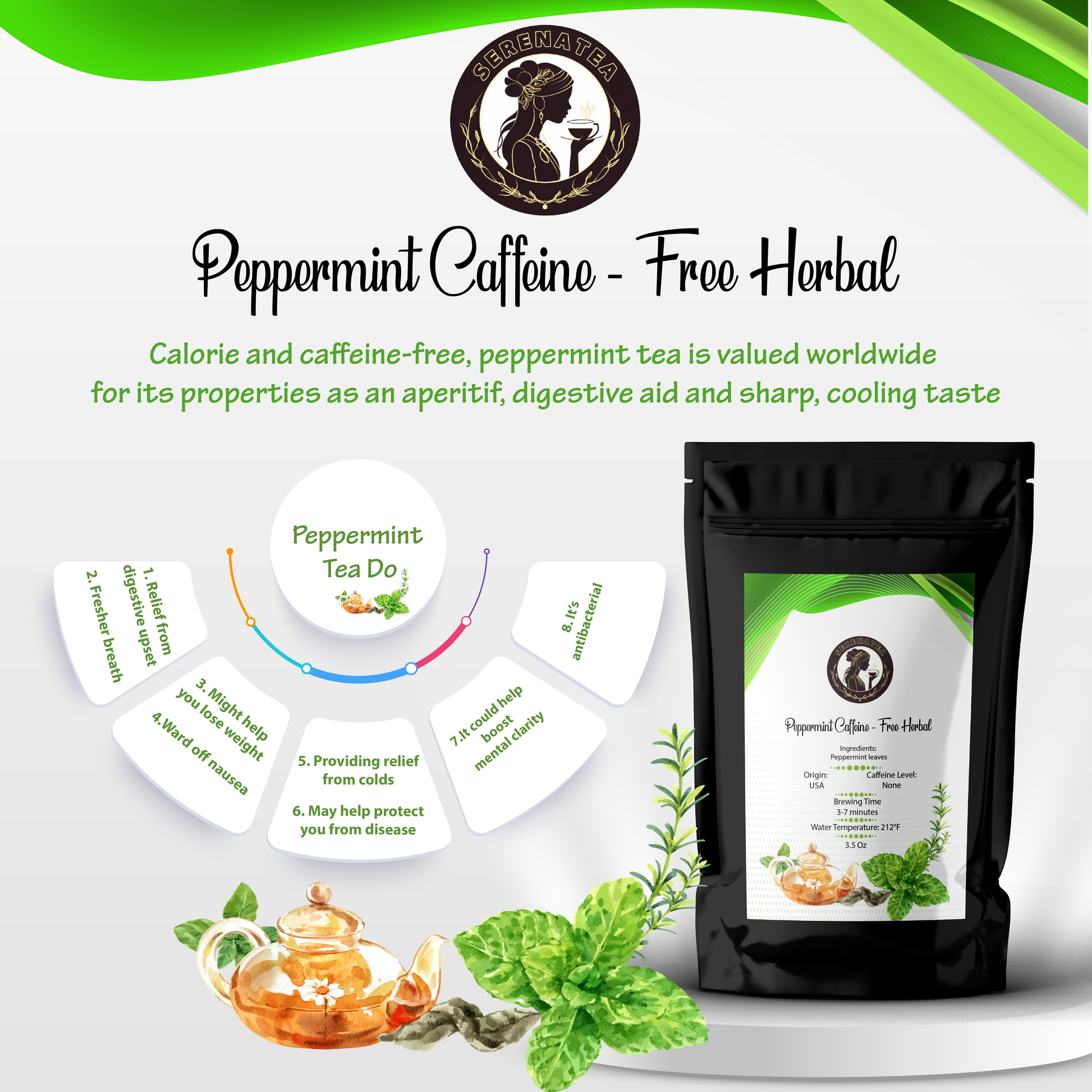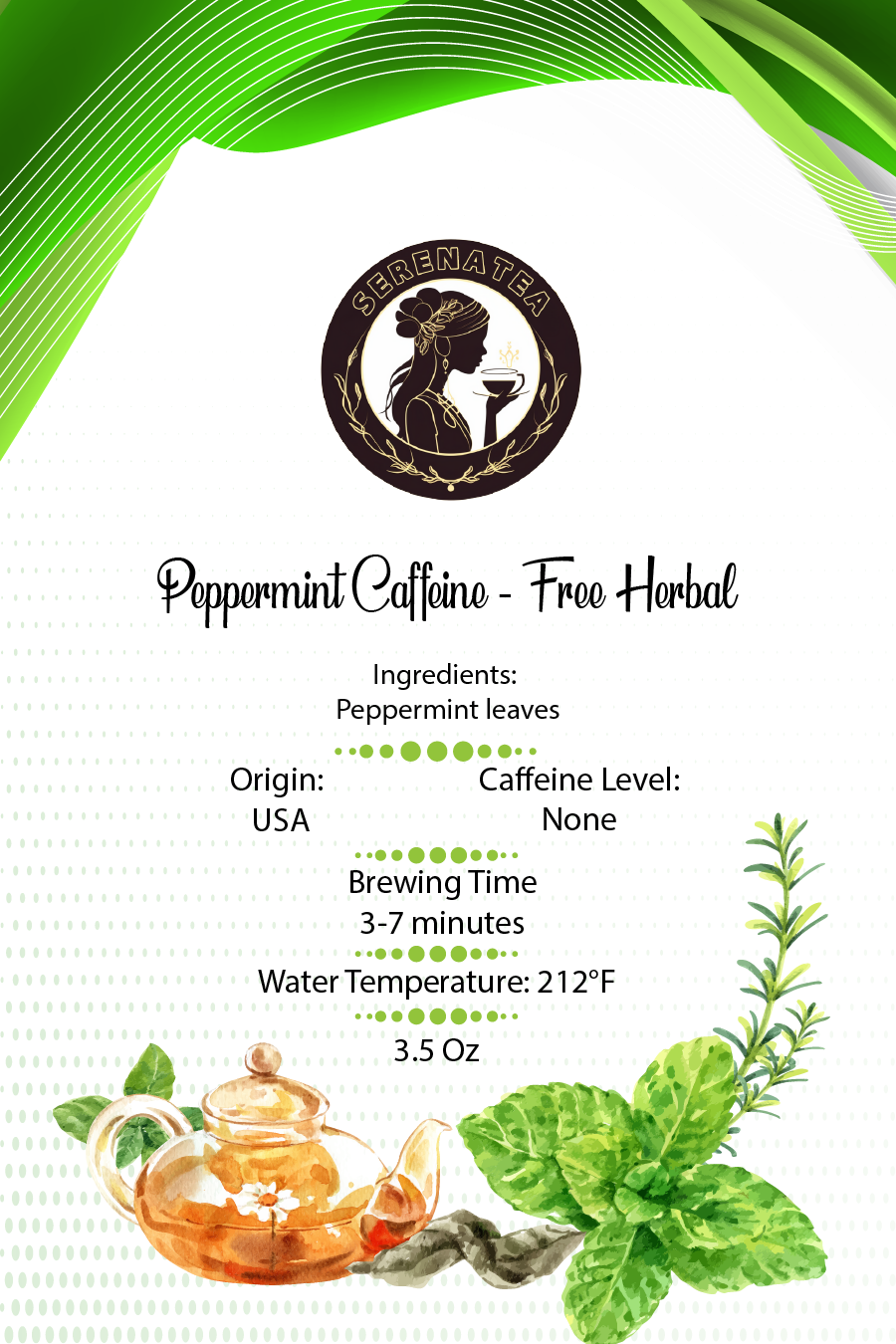 Awaken your senses with the refreshing and cooling sensation of our Peppermint Caffeine-Free Herbal Tea. This invigorating infusion features pure peppermint leaves, carefully selected for their bold and minty flavor. Each sip envelops your palate in a revitalizing burst, leaving you feeling refreshed and rejuvenated.